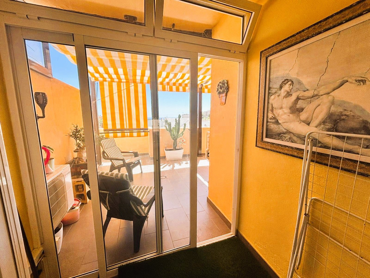 Beautiful property for sale in perfect condition in the Elviria area, close to the golf course and less than a 5-minute drive to the beach! Quiet, very residential urbanisation, ideal for permanent residence. Duplex , is on the ground level but with hight , no lift or stairs, very comfortable!!! The property is on a corner, so it is very sunny and bright and has sun all day long! Very large terrace at the entrance of the house, with awnings and afternoon sun. Upon entering, we find a spacious living room with an open, fully equipped kitchen, from the living room access to the second terrace, which faces south and offers open views of the sea, with sun all day long! There are also new awnings!
