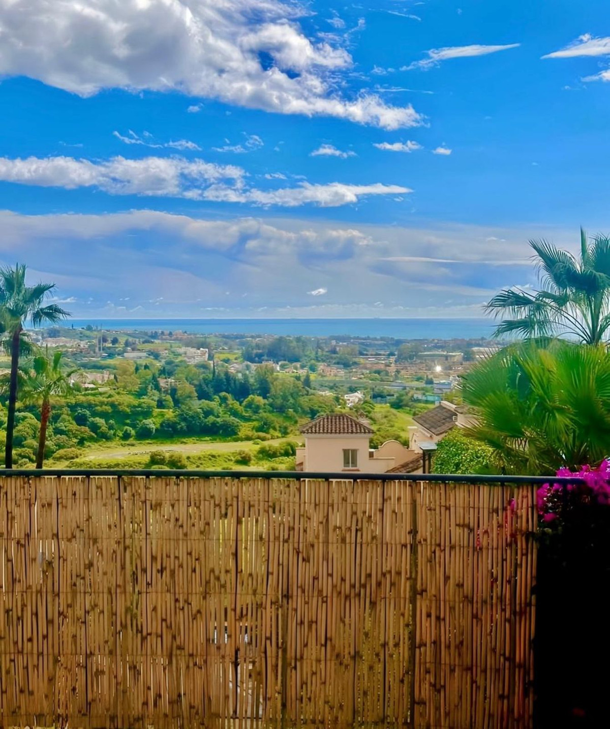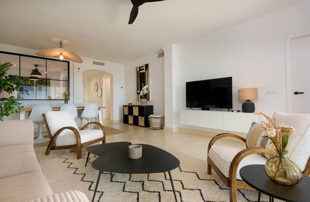 This renovated two-bedroom apartment offers fantastic views of the sea, the golf course, the communal pool, and the surrounding green hills.