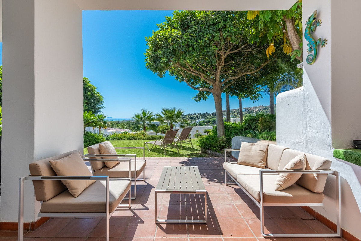 The property boasts a generous 42 m² terrace, partly covered for year-round use, and a private garden of around 50 m², creating an inviting space for outdoor dining, sunbathing, or simply relaxing while taking in the stunning views. Facing southwest, the terrace and garden enjoy long afternoon sun and sweeping vistas over the coast, stretching all the way to Gibraltar and the mountains of Africa.