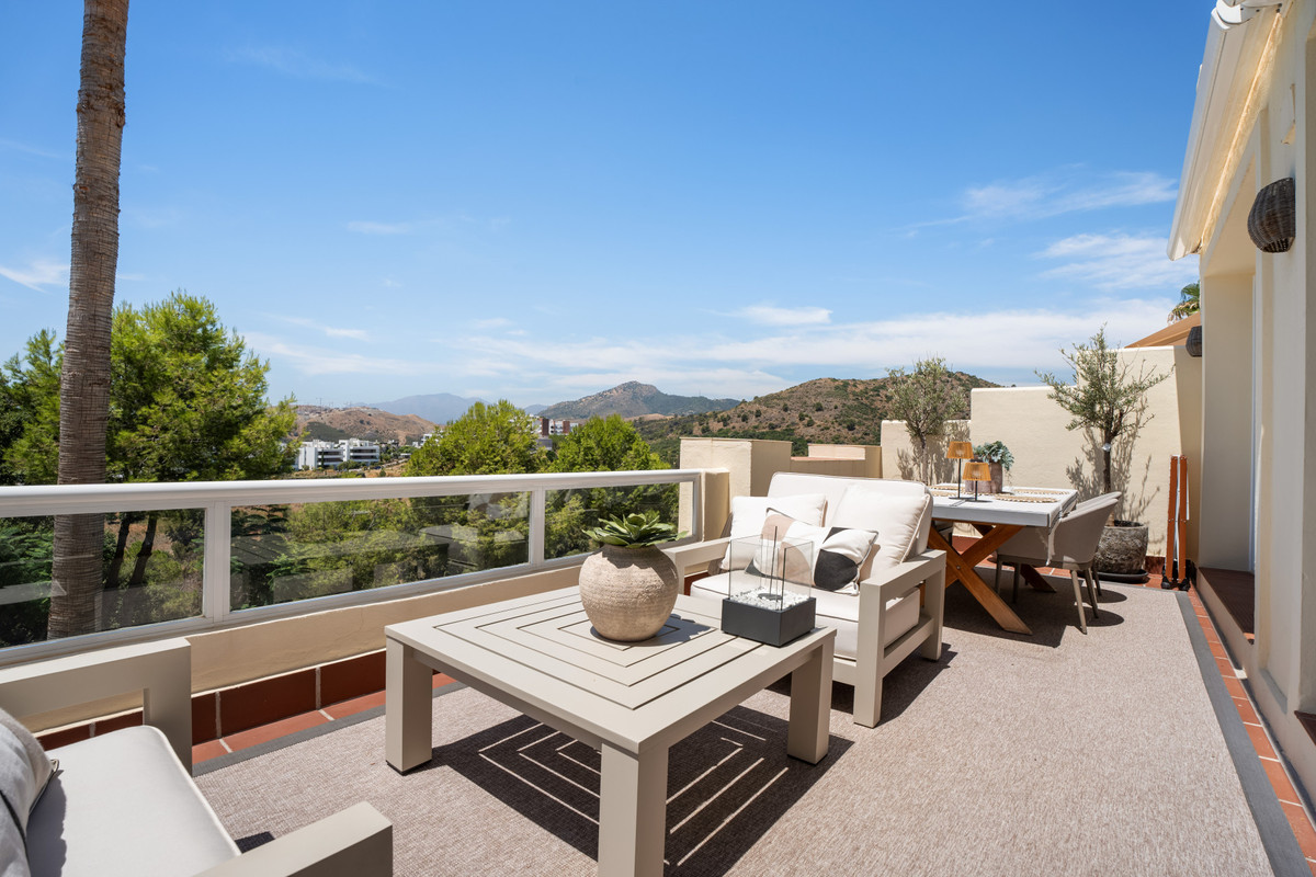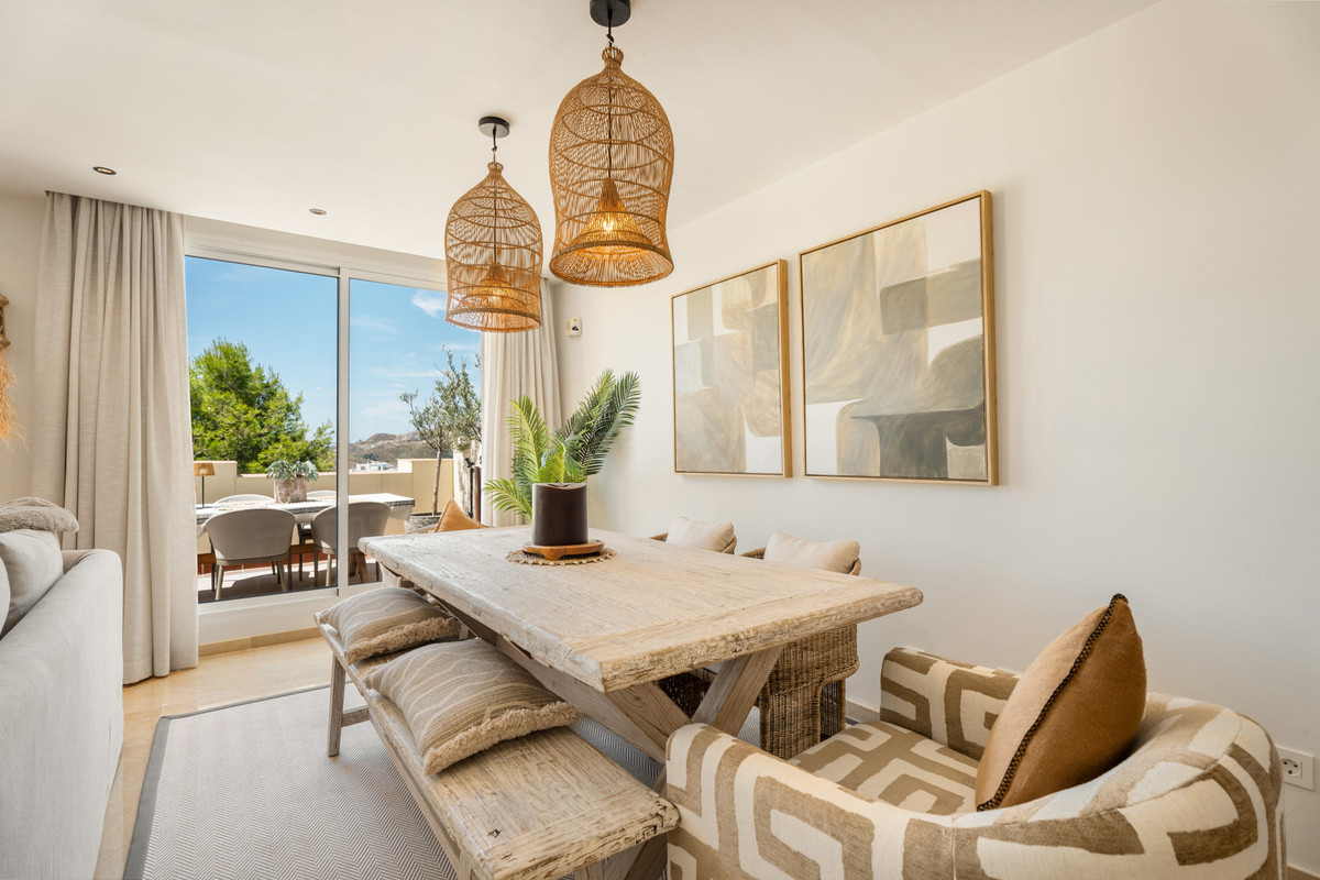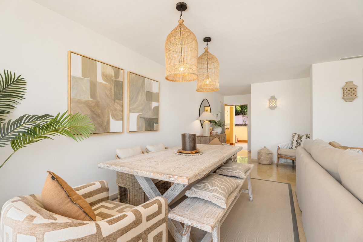 Recently renovated, this refined three-bedroom, corner apartment is set within the secure, gated community of Ocean Pines in Benahavís. Surrounded by nature and just minutes from golf courses, restaurants, and San Pedro town center, the property offers panoramic views across the mountains and the communal gardens.