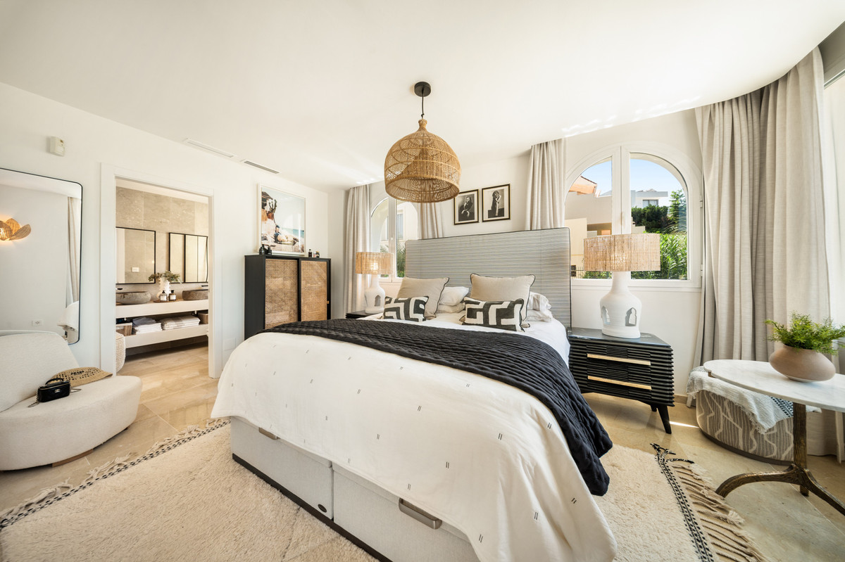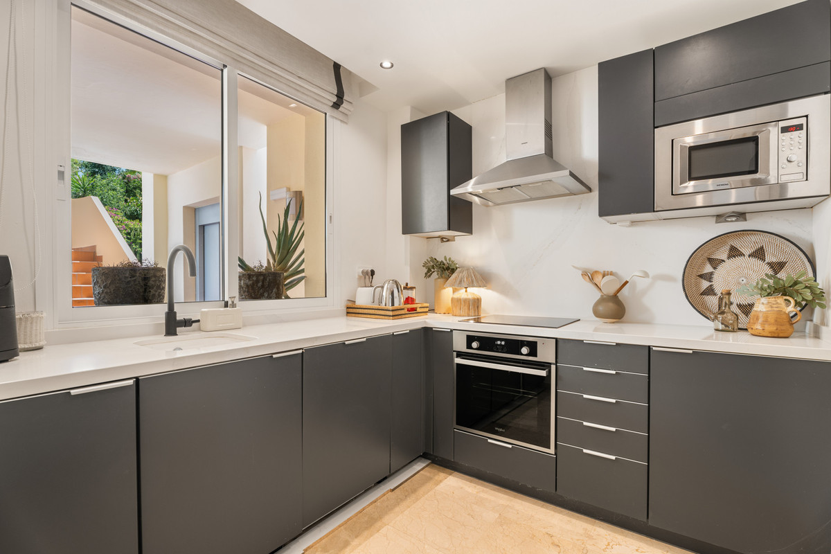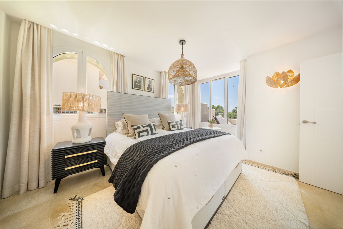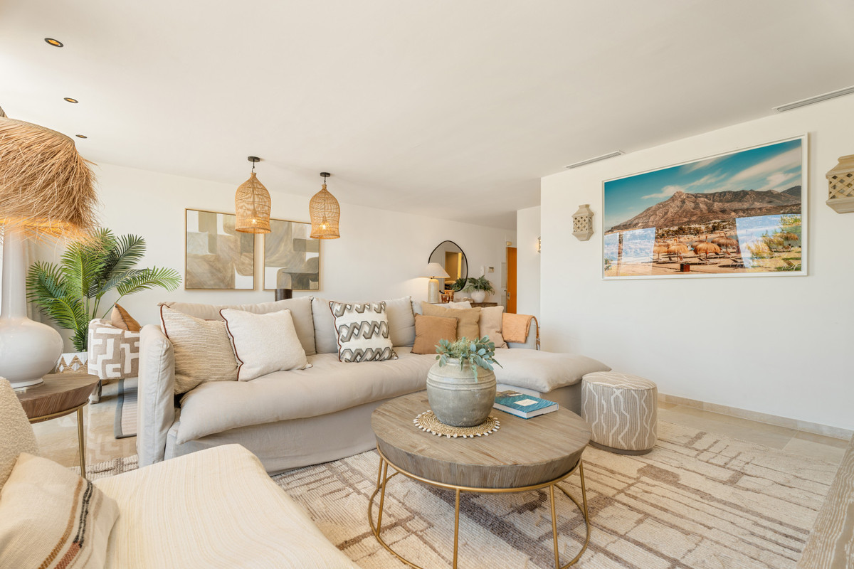 Recently renovated, this refined three-bedroom, corner apartment is set within the secure, gated community of Ocean Pines in Benahavís. Surrounded by nature and just minutes from golf courses, restaurants, and San Pedro town center, the property offers panoramic views across the mountains and the communal gardens.