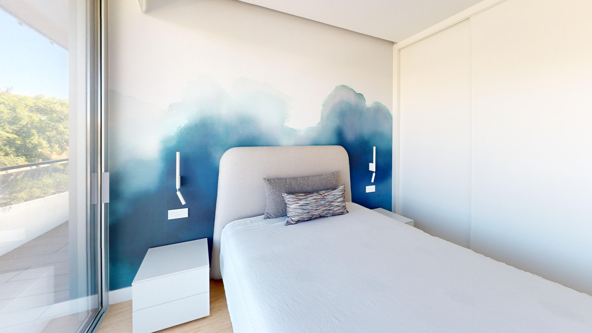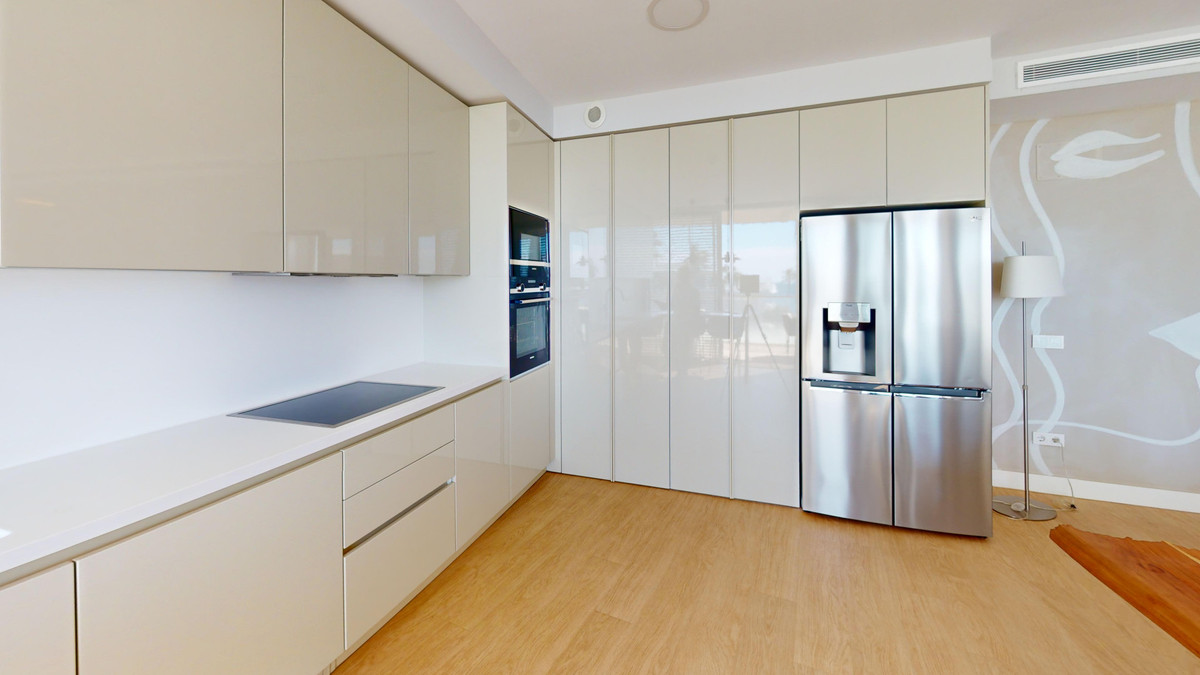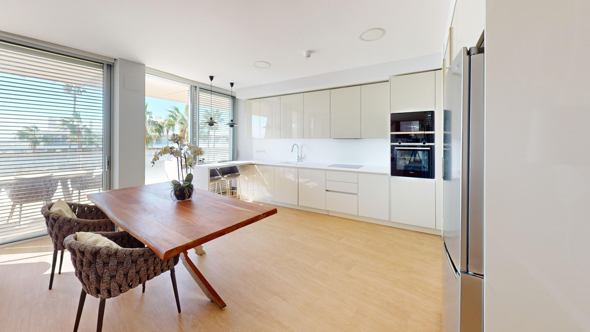 The living area comprises a large living-dining room with an open-plan kitchen, designed for social and family life, and connected to a large terrace where the sea views take centre stage at every moment of the day. The sleeping area has four bedrooms, including a master suite with a private bathroom and fitted wardrobes. The finishes are in keeping with the standard of the complex, which stands out for its high-end materials and organic lines inspired by the maritime environment.