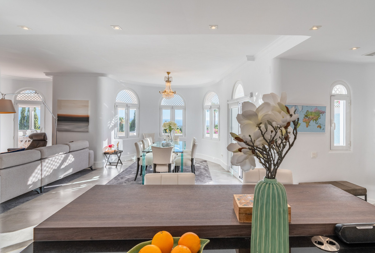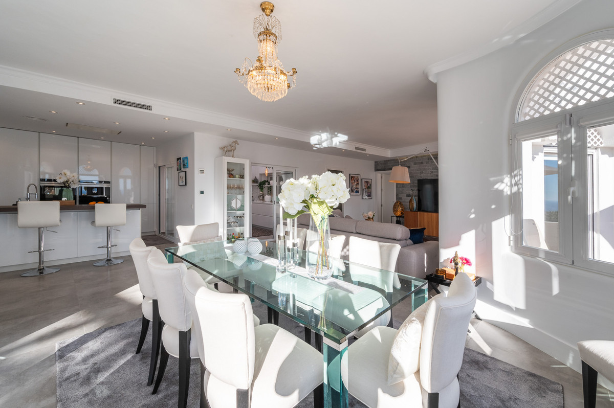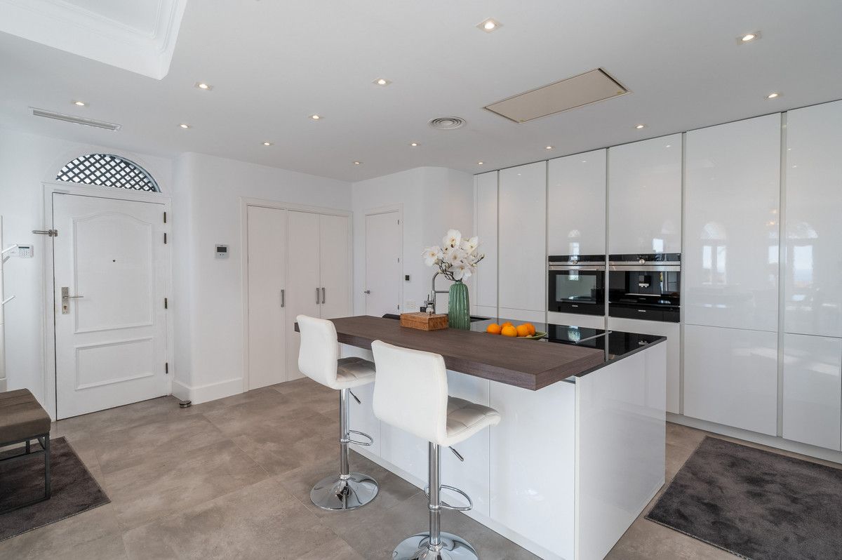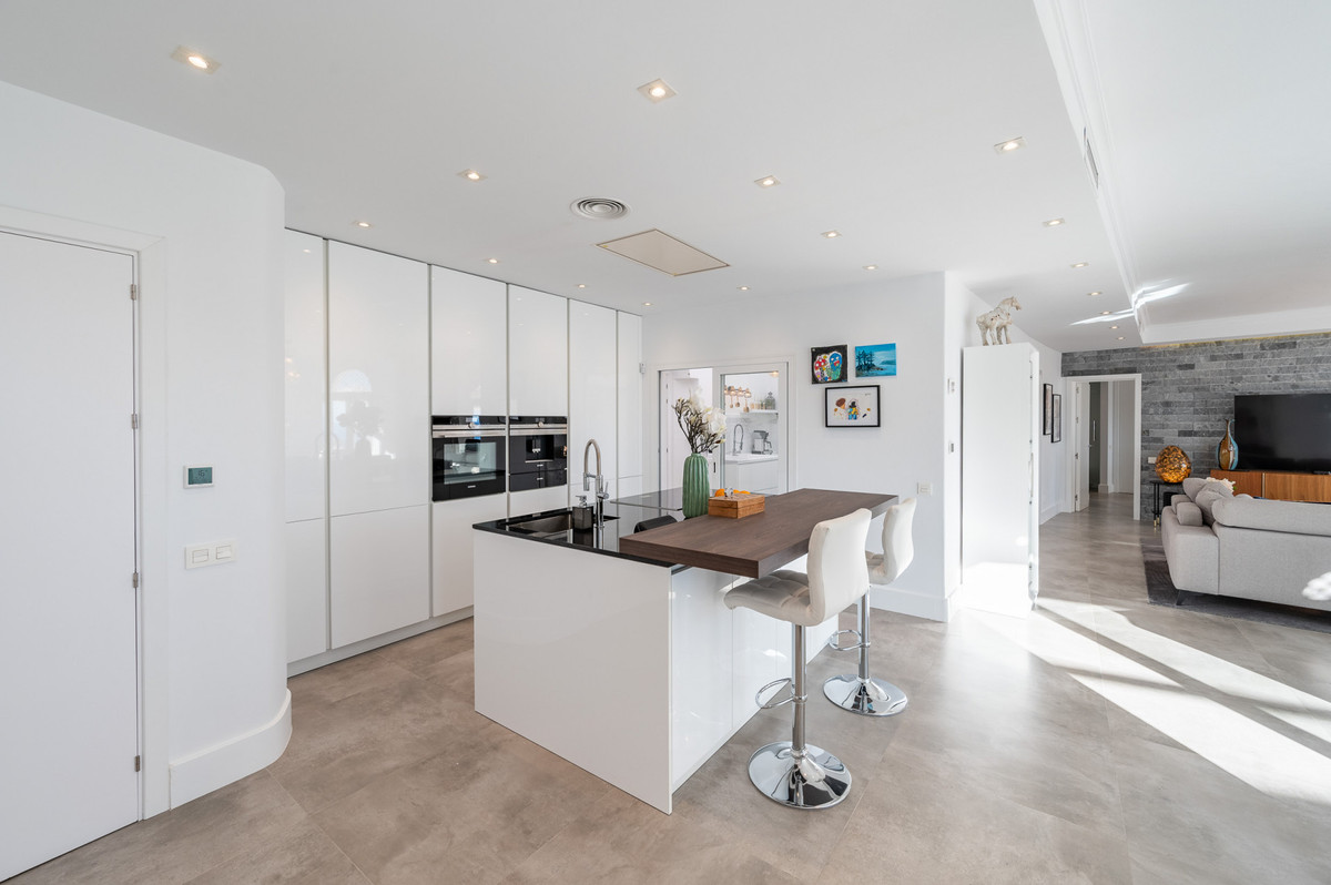 The apartment spans 212m², with 180m² of living space and a 44m² terrace. Both bedrooms feature en-suite bathrooms located on the upper floor, ensuring privacy. A guest room and three toilets (including a guest WC) add convenience. The open-plan living and dining area opens to the terrace via glass doors, blending indoor and outdoor living. The fully fitted kitchen includes modern appliances, perfect for everyday use or entertaining, complemented by beautiful glossy white cabinets and a central island with seating for two. Key features include underfloor heating, air conditioning, electric blinds, fitted wardrobes, high-speed Wi-Fi, and a security alarm. The gated community offers a private pool, garage, and storage room. Furniture is optional for easy move-in.