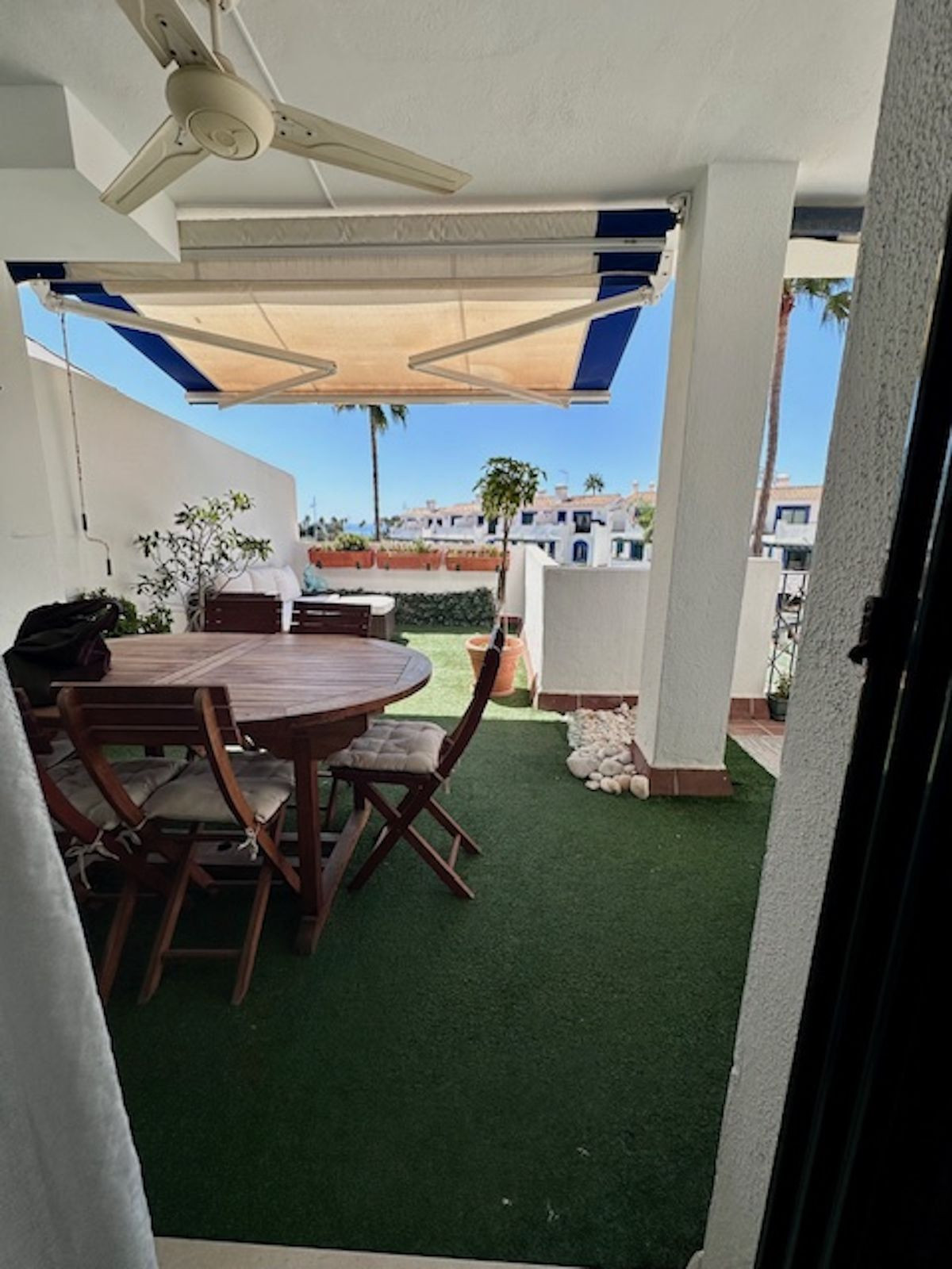 The living room opens onto a magnificent terrace, which is fully covered with awnings for winter use and offers stunning views of the development's pool and the sea, as this development is located on the beachfront.