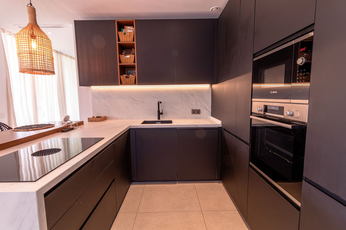 The high-end kitchen is equipped with BORA and BOSCH appliances, perfect for gourmet lovers. Enjoy breathtaking golf and pool views from the expansive terraces.