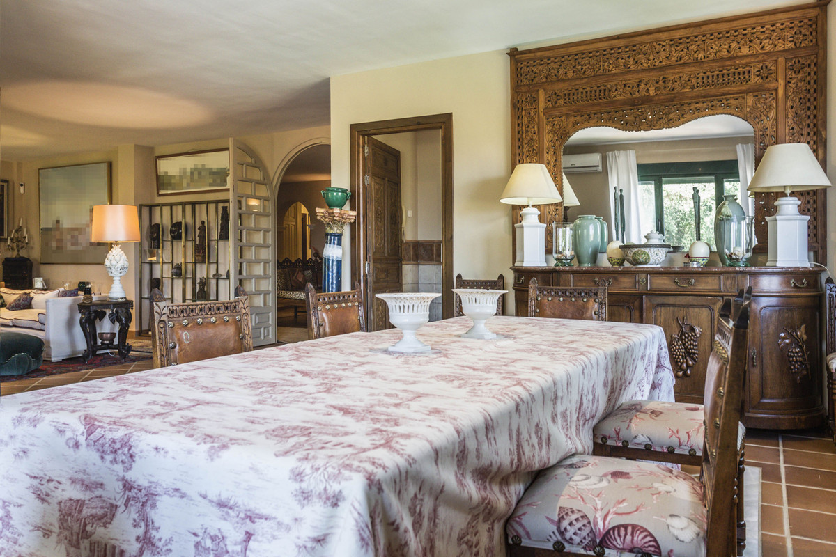 Detached two-story villa in the coastal area of Sotogrande. On the first floor, we find a spacious entrance hall leading to 3 large bedrooms, a kitchen, and a living room. The bedrooms have en-suite bathrooms, while another is located in the hallway. The kitchen has a pantry and a separate toilet. The bright living room opens onto a spacious L-shaped porch, which overlooks the garden and a gazebo with views of the pool and the mountains. From the entrance hall, there is also access to the lower floor, a separate area with 2 bedrooms and 2 bathrooms, as well as a kitchenette integrated into a living area with a fireplace. This floor is ideal as an independent apartment, as it also has access through the garden or garage (with capacity for 4 cars). The garden has a charming and modern bathroom with a shower, perfect for use when swimming in the pool. Air conditioning and central heating are available. The property is conveniently located, a 5-minute drive from supermarkets and the Paniagua shopping center, and is also a very quiet area. The property was partially renovated in 2024.