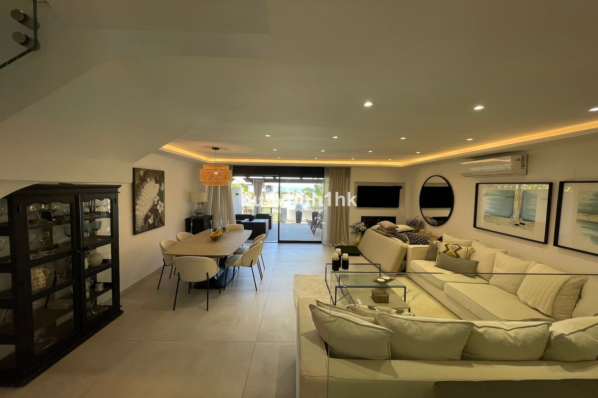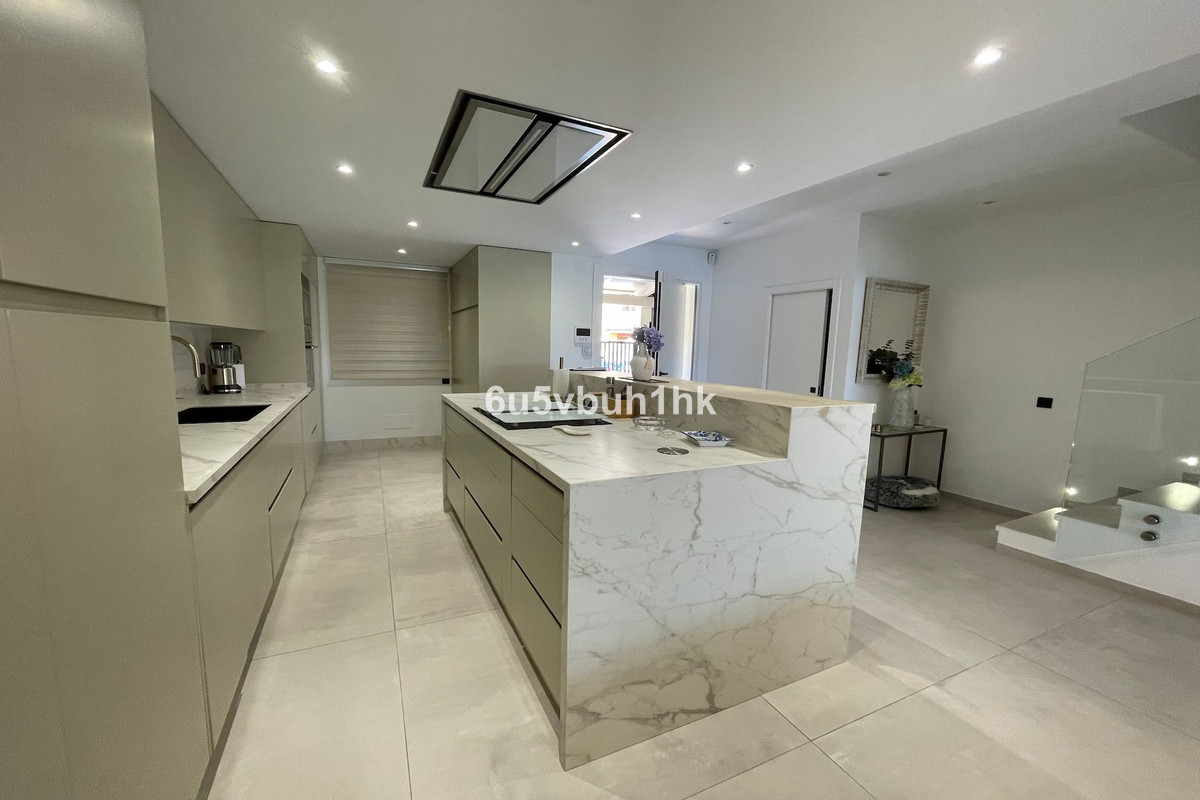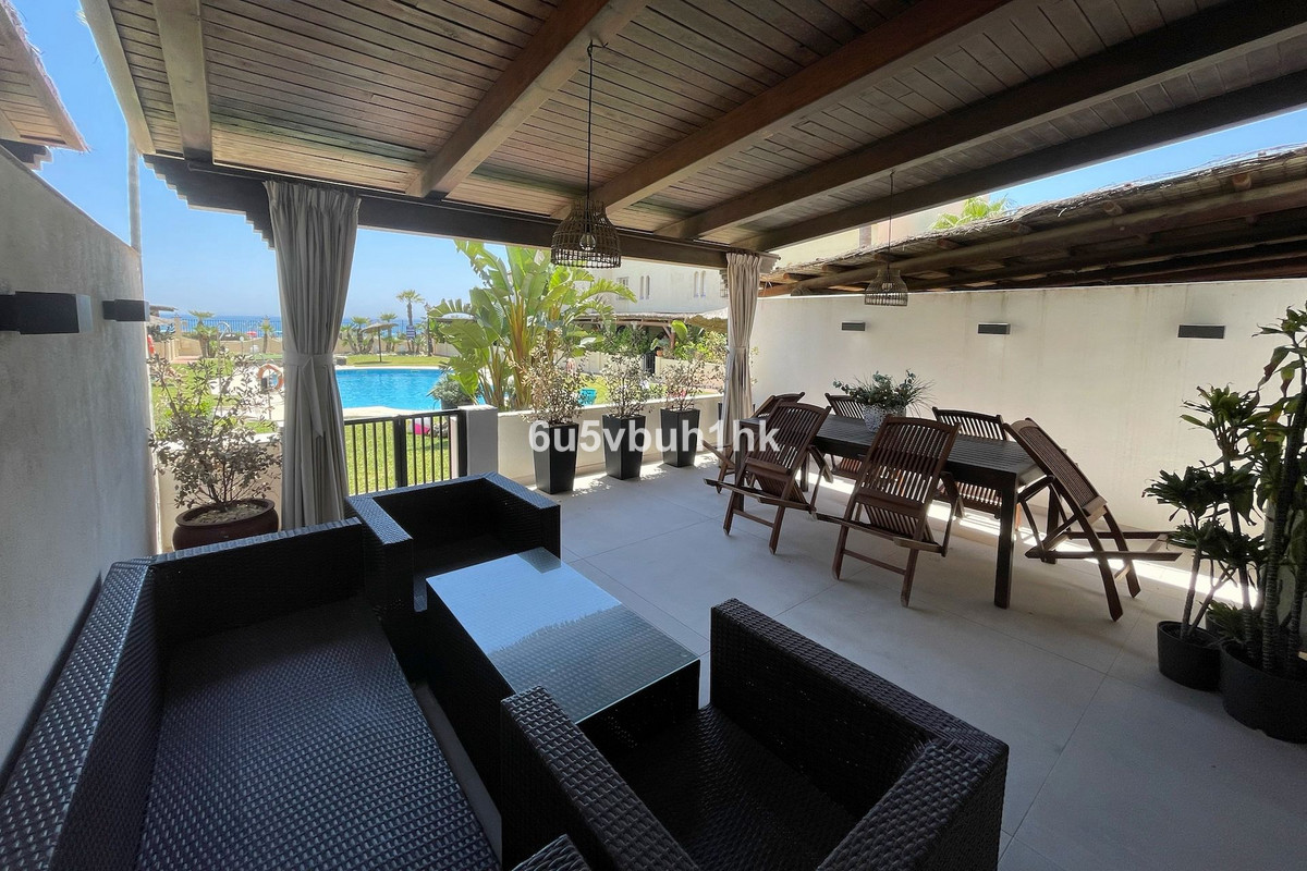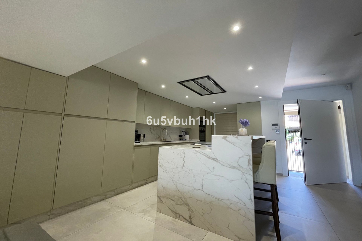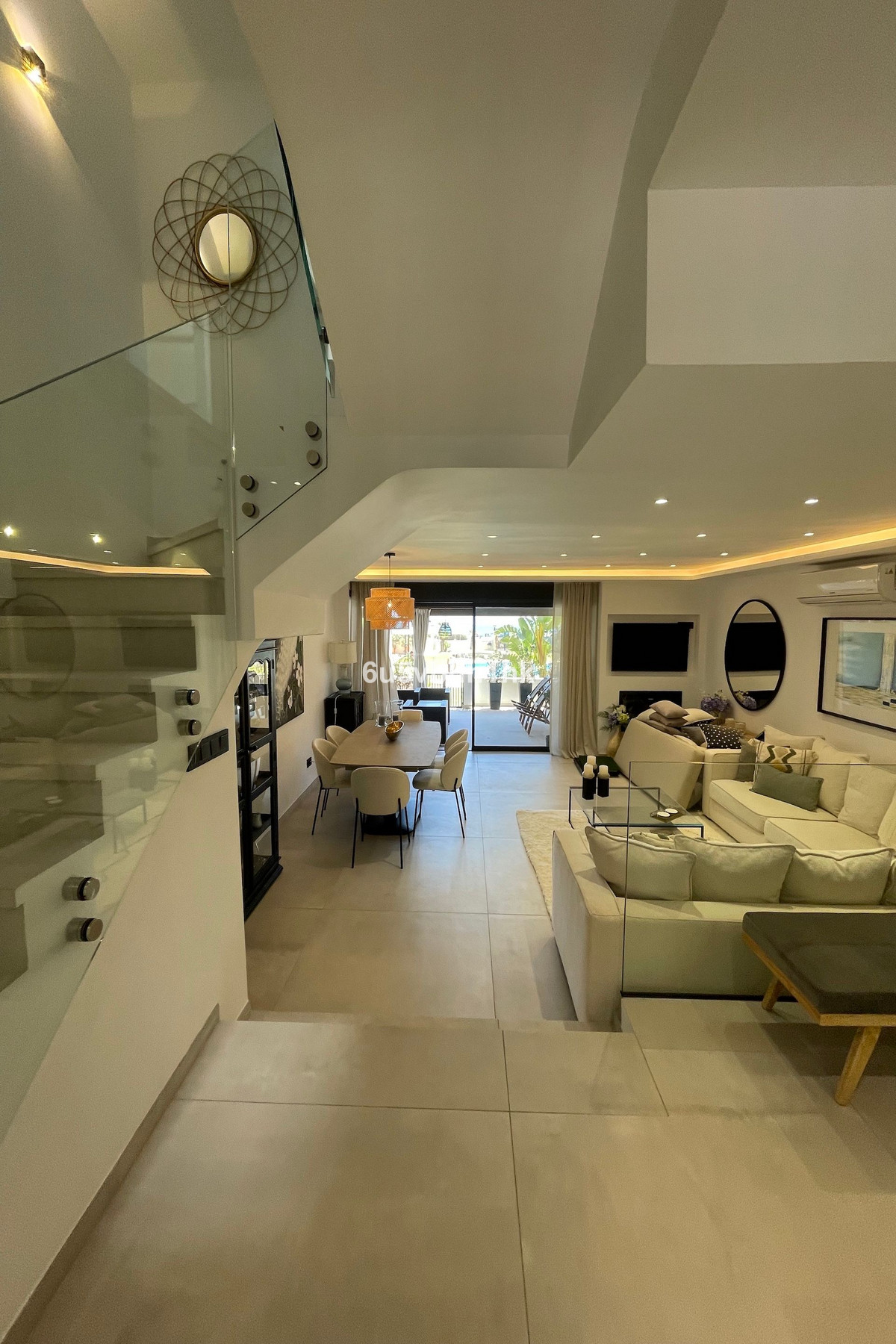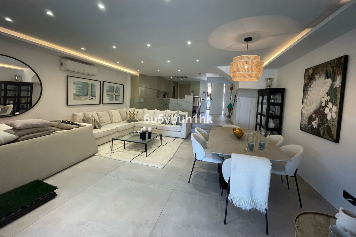 A well distributed bright south facing townhouse built over three floors, in a small beachfront community of houses, with direct access out to the beach through the community gate. The property has been fully reformed to a high standard with new carpentry, solar panels, security blinds, alarm and many personal touches and modern appliances. It has floor to ceiling windows, and good quality finishes throughout.