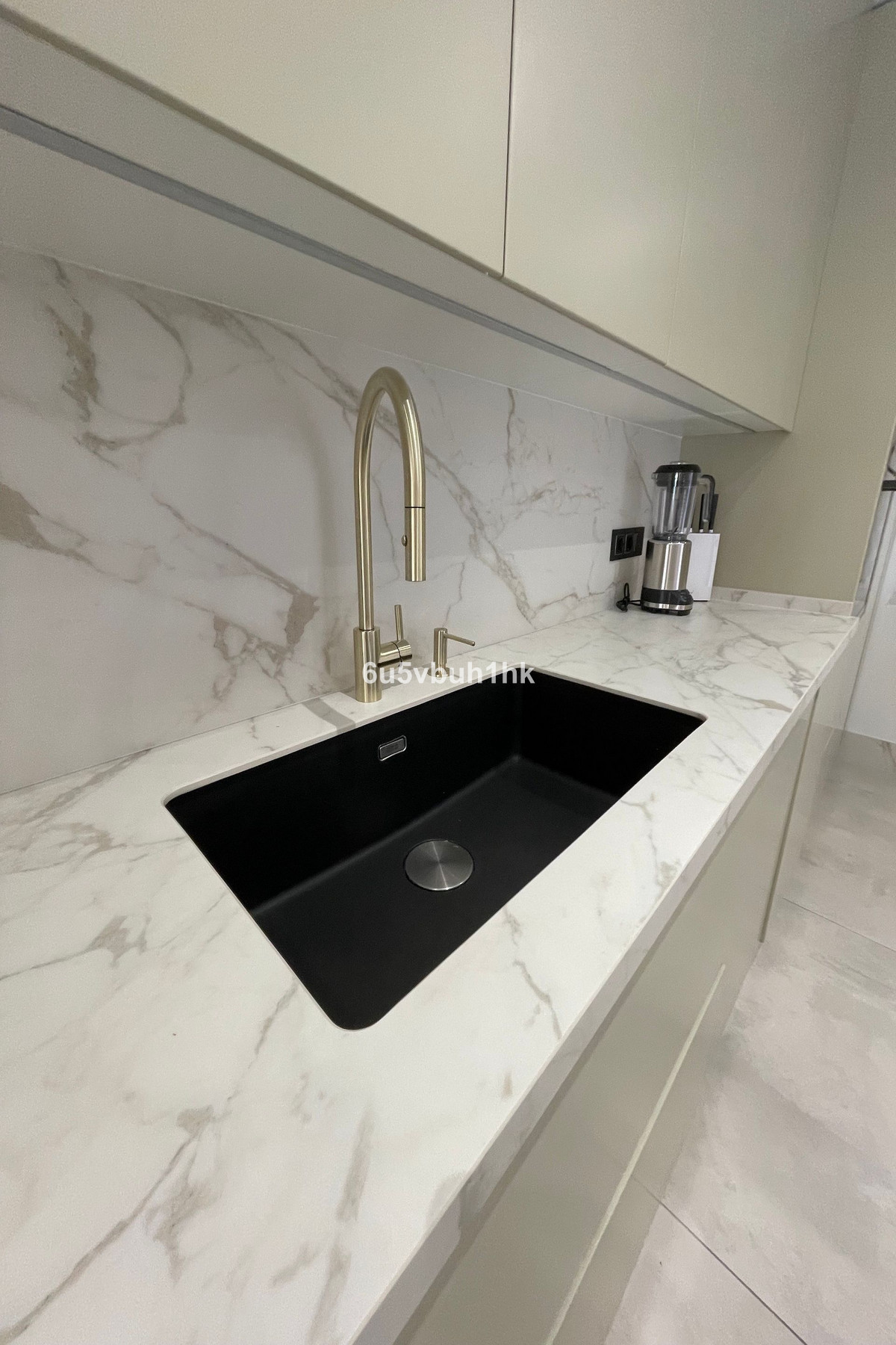The impressive front door leads into an open plan kitchen and living room area which flows out onto a private patio with direct views to the sea and a gate to the community area. The kitchen is fitted with modern appliances and is ample in size with plenty of storage space.